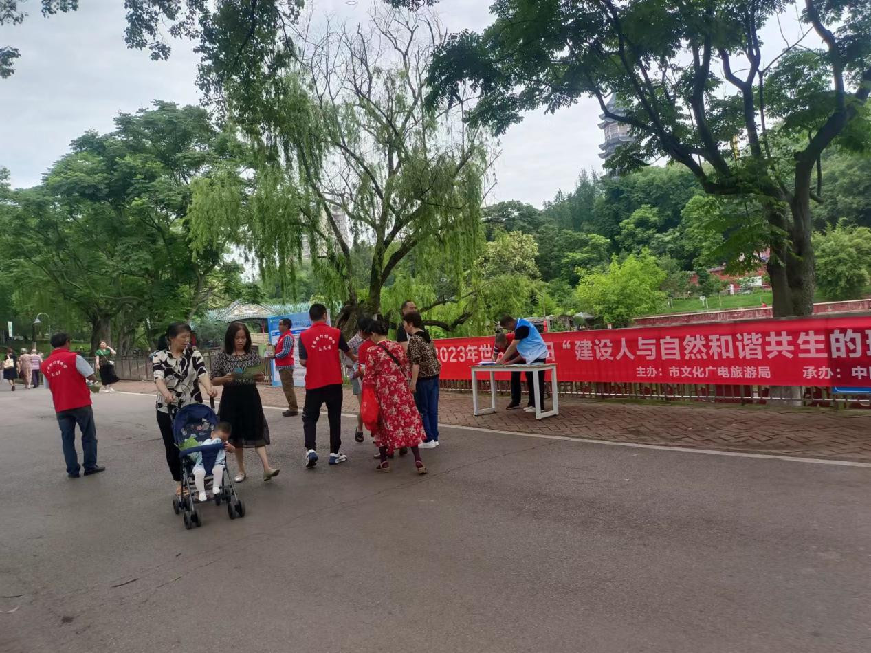 馆园相关部门工作人员和环保志愿者在公园景观湖前设立环境宣传台,为游客宣传讲解环保知识,散发科普资料,开展咨询服务,让过往游客了解生态环境建设的重要性,动员他们共同参与环保维护中。