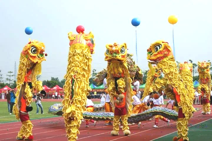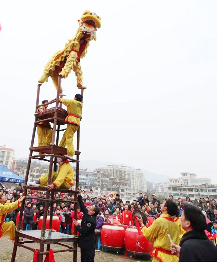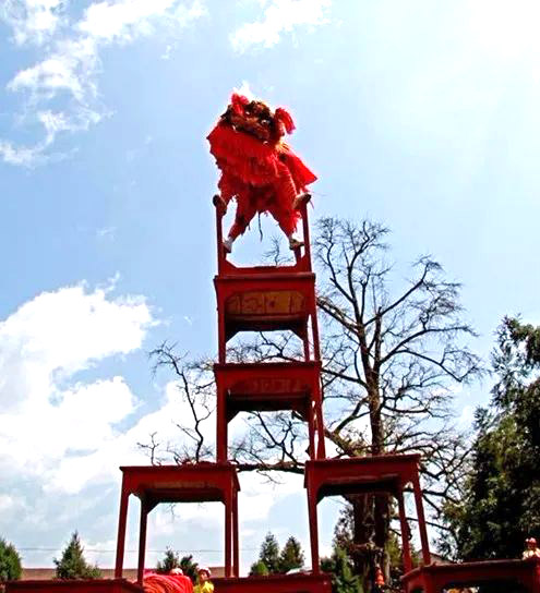 2、动作特征:先是沙头(沙面和尚)上高台桌的最顶层做“洗面”动作(意为给全村的寨民洗去所有邪气)。其次是两个小狮上台“翻天云”(意为上天接福)。再次是单狮或双狮上台“踩斗”(意为护福回寨)。