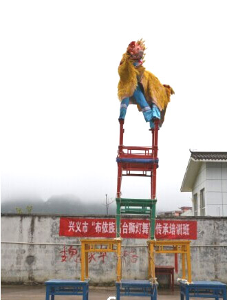 在黔西南布依族苗族自治州兴义市马岭镇瓦嘎村流传承着一种布依族世代相传的民间杂技艺术——布依族高台狮灯舞。