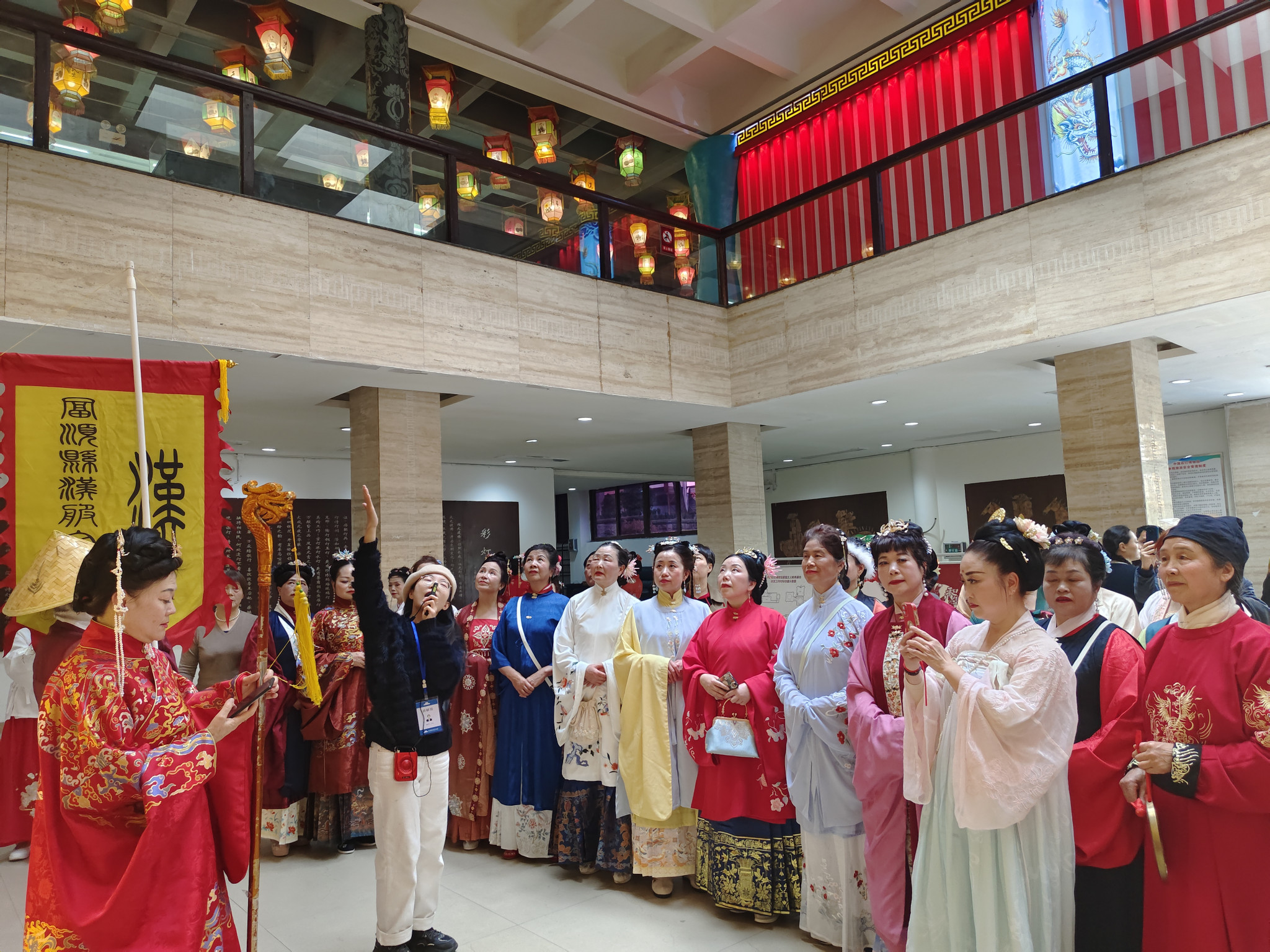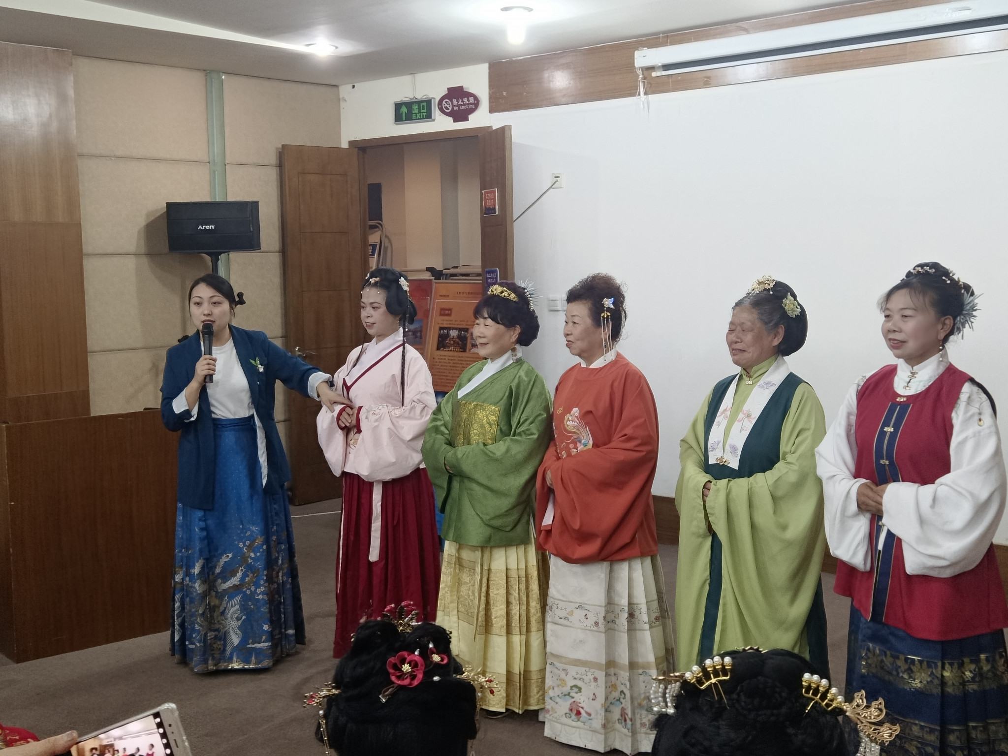 随后,来自青衿阁汉服文化馆的杨瑶老师从历史发展、传统礼仪、服饰种类、妆发造型等方面为大家解读汉服文化,并邀请现场身着不同款式的参与者上台,让大家更加直观地学习传统服饰文化。活动现场吸引了不少年轻的博物馆参观观众:“穿汉服原来这么讲究!看得出来姐姐阿姨们对汉服穿搭和礼仪还是很有研究的,值得我们学习。”