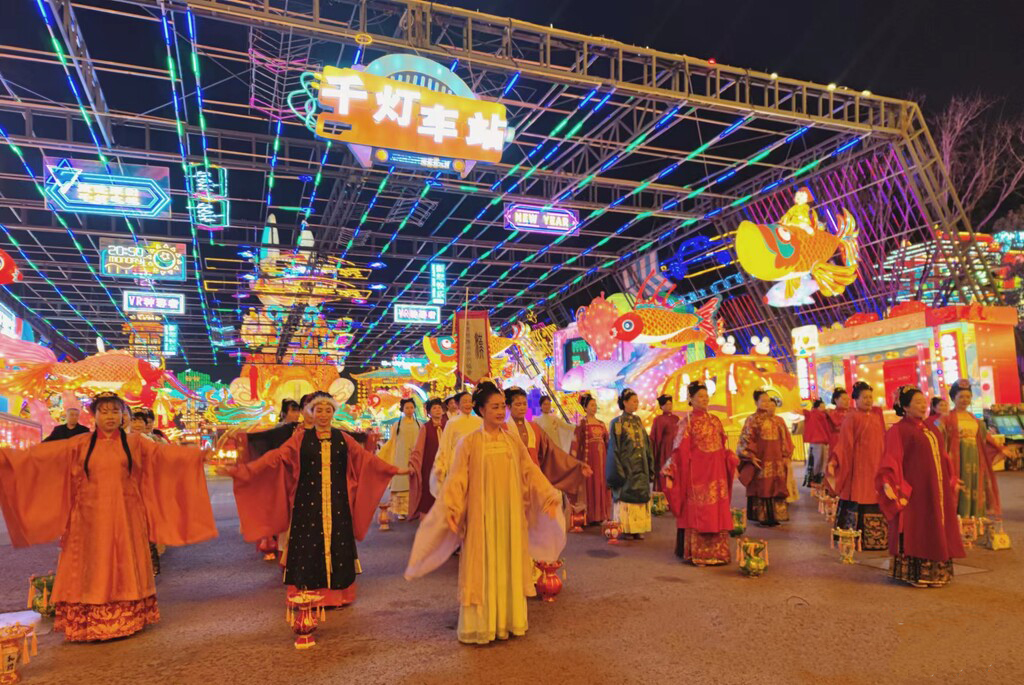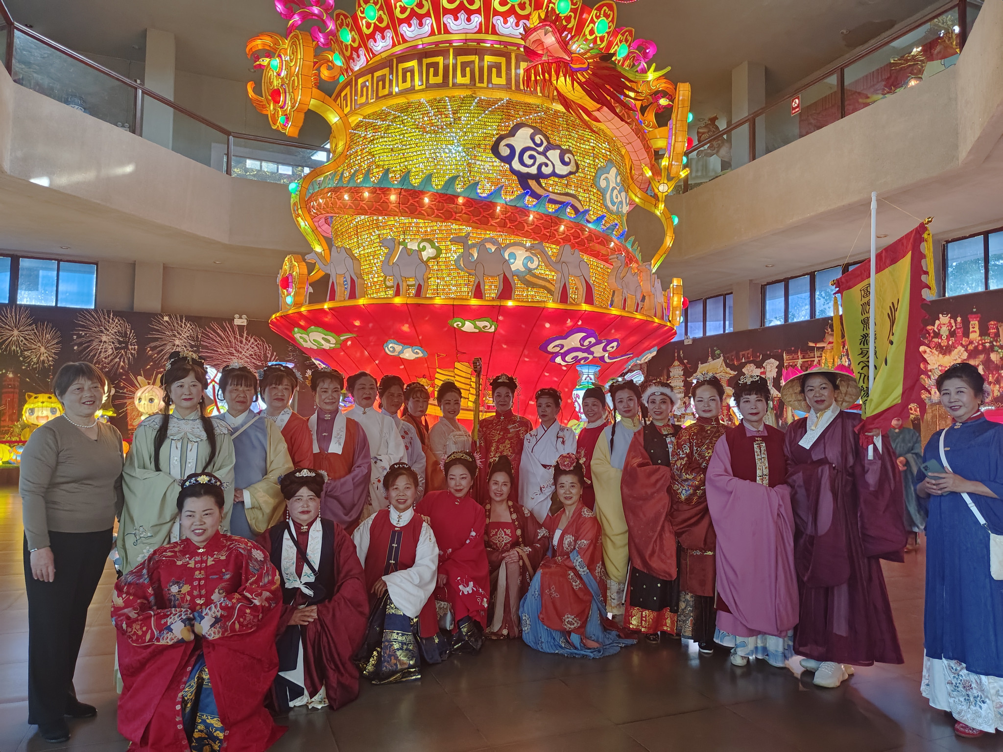 下午,汉服爱好者们参观了中国彩灯博物馆,她们款款而行、仪态万方,在传统灯组的映照下恍若走入了汉唐盛世的灯影之会中。