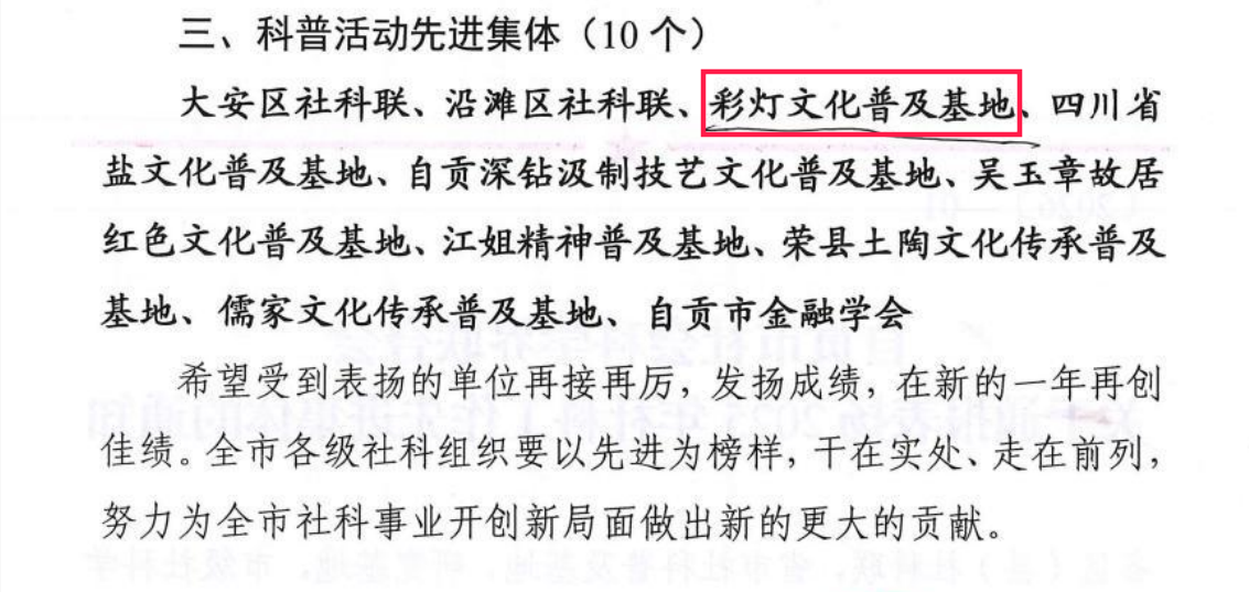 近日,自贡市社会科学界联合会召开了2026年社科工作会议,通报表扬2025年社科工作先进集体。彩灯文化普及基地被授予2025年“科普活动先进集体”荣誉称号。