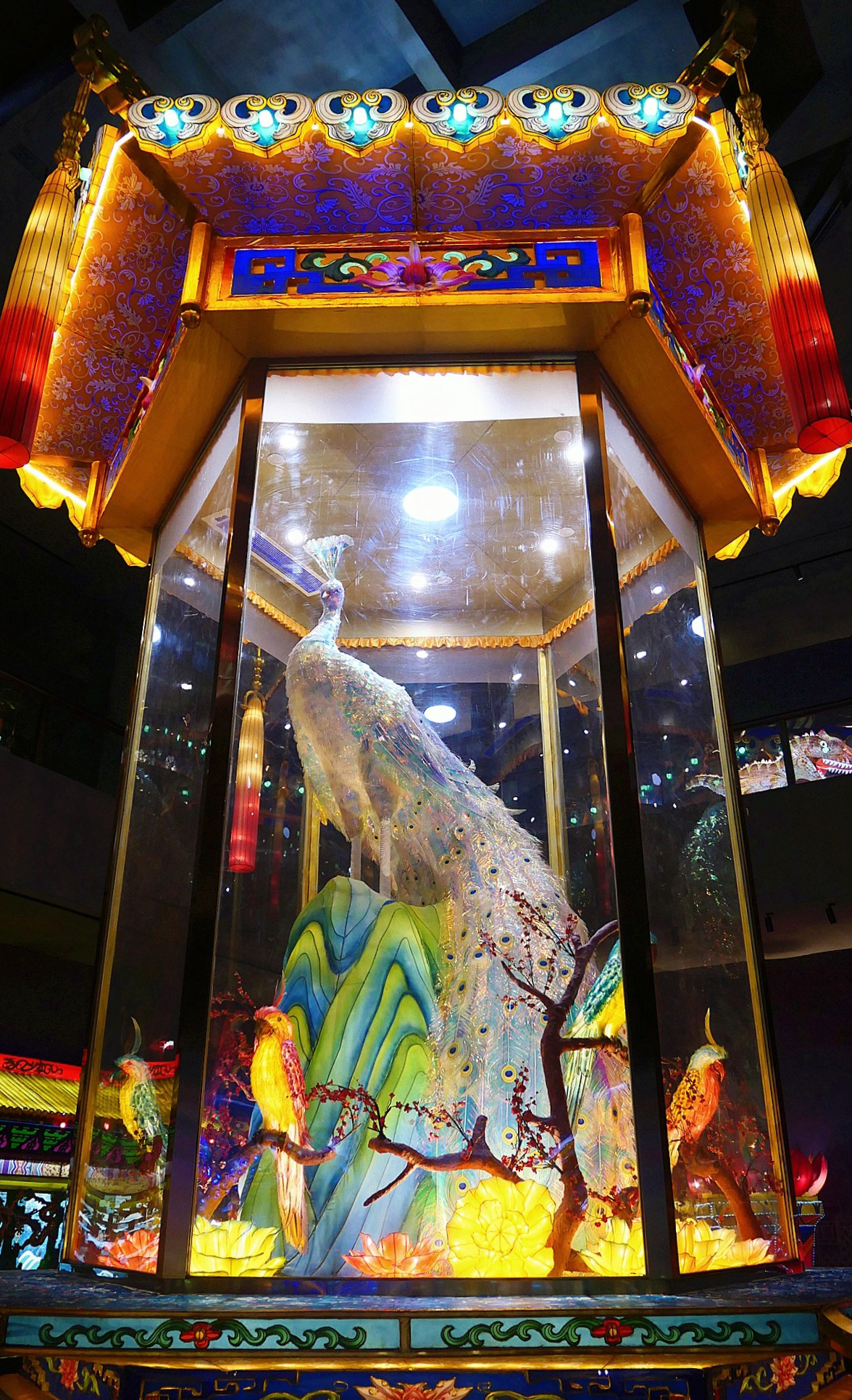 “雀之灵”作为第30届自贡国际恐龙灯会最受关注的大型彩灯之一,长8米,高12米,将吹塑剪纸工艺与幻彩亚克力材料紧密贴合,使用的孔雀羽毛多达3万余片,共剪裁近1200万刀,由20余名工匠历时近2月制作完成。仰望观赏,炫彩的孔雀站在高处缓缓转动,头部来回张望,四周花团锦簇,寓意着祖国一派和谐繁荣的景象。