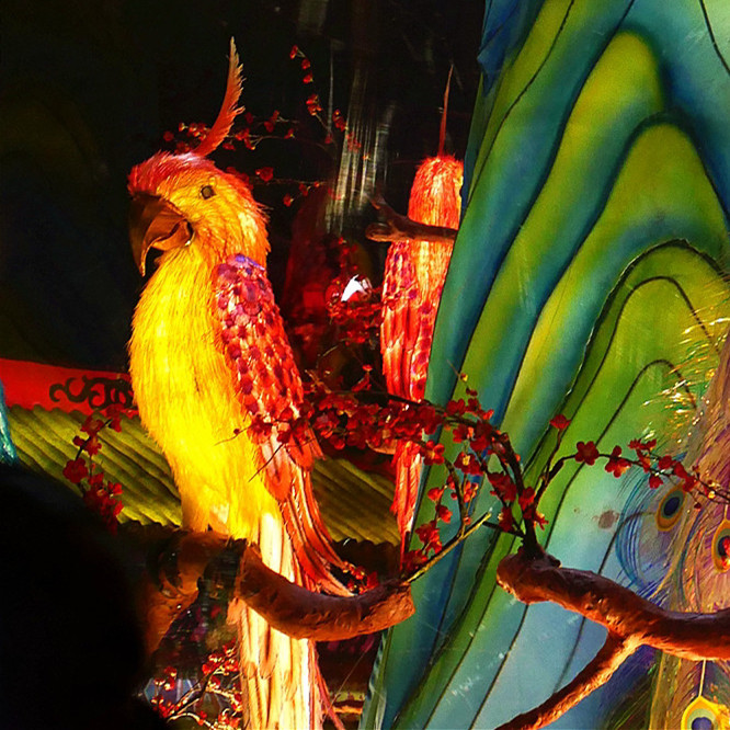 值得一提的是,该灯组还运用了机械传动、人工智能技术等现代技术,观众可以通过话筒把话传递给鹦鹉,鹦鹉再用俏皮的语气复述出来,活灵活现,惟妙惟肖。