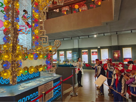 随后,孩子们有序跟随博物馆科普讲解老师走进中国彩灯博物馆参观基本陈列,感受中国灯文化魅力。在参观过程中孩子们发现,原来钻木取火的故事也跟远古“神鸟”有关。人们对鸟类的喜爱也体现在了灯具中,不同历史时期的灯具都用到了鸟类的形象:比如汉代的“朱雀灯”、明清时期的“铜仙鹤烛台”等等……鸟儿们带着“喜庆、长寿、好运”的美好寓意,随着灯火在历朝历代中闪闪发光。