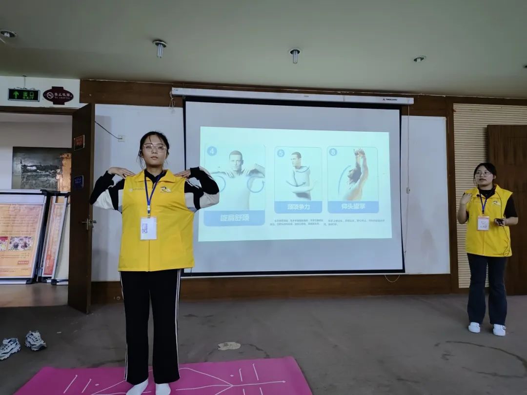 讲座现场,来自四川卫生康复职业学院康复学院的学生志愿者姜钰、张梦缘不仅为大家讲解了肩颈腰不适的原因以及改善方式,还亲身示范了改善不适症状的正确方式,观众们边学边做,现场气氛十分活跃。