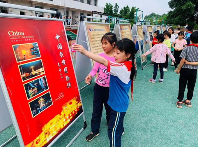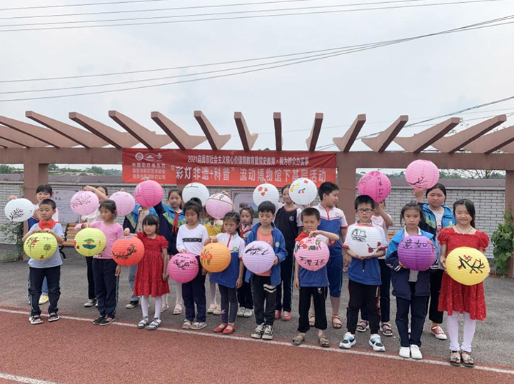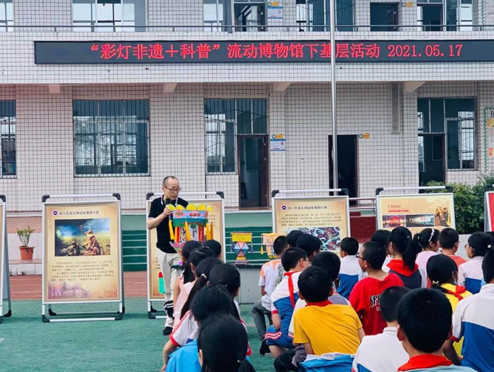 5月17日,结合党史教育为民办实事和社会主义核心价值观教育,馆园以流动博物馆下基层的形式,组织了“彩灯非遗+科普”走进荣县古文镇小学。在学校操场上,博物馆相关负责人向全校200多名师生现场讲解彩灯非遗知识。同时,邀请了第十四届自贡市职工技能大赛彩灯制作工艺大赛二等奖获得者、星河彩灯文化公司美术师刘新平,现场指导同学们进行彩灯制作。在专业老师和博物馆志愿者的引领下,同学们聚精会神聆听讲解,踊跃参与互动,亲手绘制了一个个漂亮的彩灯。活动拉近了师生们与彩灯文化的距离,让学生在潜移默化中接受了保护非物质文化遗产的思想,引领非物质文化遗产传承,受到了广大师生的一致欢迎。