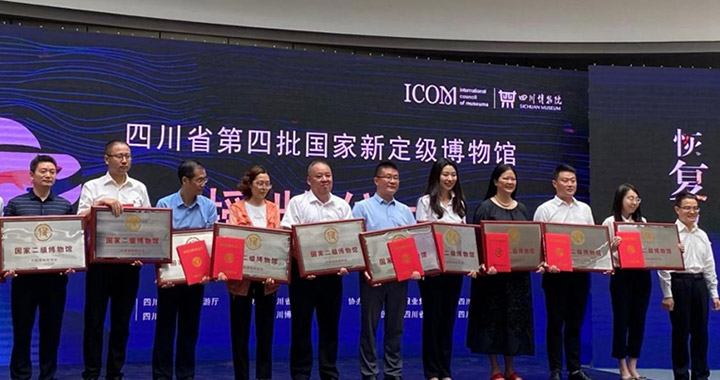 5月18日,在省博物院举行的2021国际博物馆日四川主会场上,省局代中国博物馆协会向第四批国家新定级博物馆授牌并颁发等级证书,戴燕灵馆长上台接受了授牌。目前,全国登记博物馆5788家,国家一、二级博物馆659家;全省登记292家,一、二级馆31家,晋级国家二级博物馆,跻身全国、全省博物馆的前12%和10%,体现了本馆综合管理和专业能力提升实现了历史性突破。