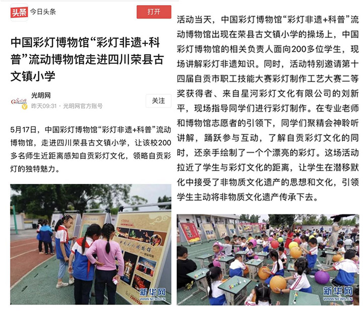 期间,馆园组织了“传非遗精粹?展灯博形象”短视频集中展播周。通过在博物馆“两微一网”宣传平台上集中展播近年来馆园与中国华文教育基金会制作的全球华文实景课堂《自贡灯会》、四川卫视《想走就走的旅行?打卡四川彩灯游园会》、安徽卫视《超级新闻场?中国彩灯博物馆》、四川电视台公共乡村频道《金字招牌?一盏灯一座城品自贡灯会的独特韵味》等专题节目,及与自贡川南影视制作公司合作制作的自贡彩灯传统制作技艺宣传片《匠心汇聚,巧夺天工》,与自贡易胆大文化传播公司联合摄制的《满满带你逛灯博》等宣传片,传播自贡灯会民俗、自贡彩灯传统技艺精粹,展示馆园景区形象,促进了文博文旅、研学科普活动的开展。