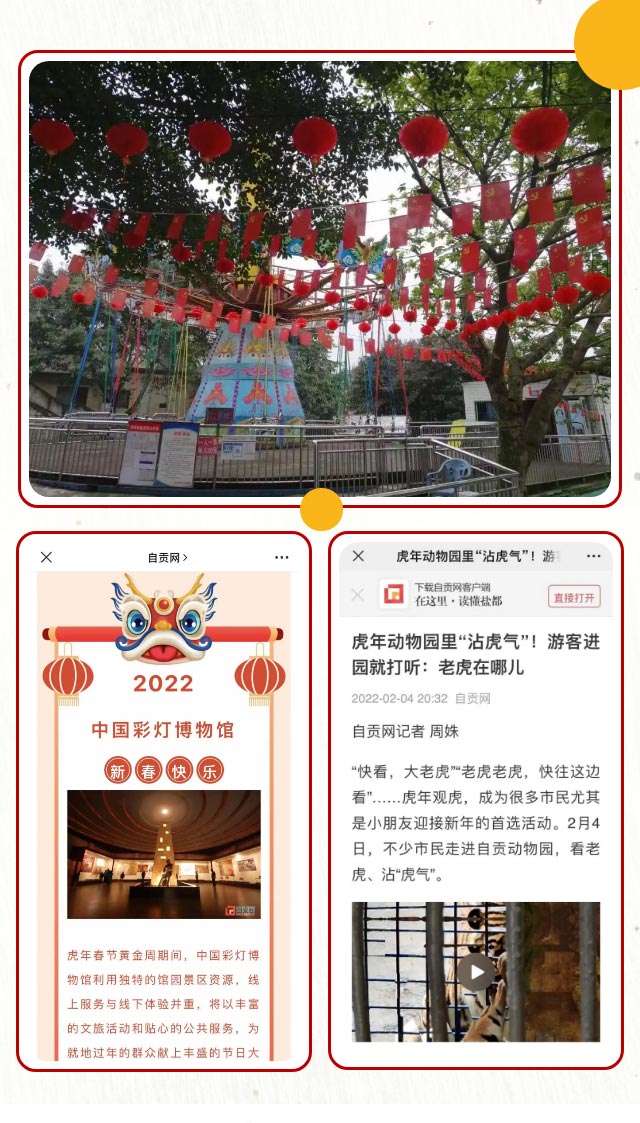 节日期间,馆园加强媒体宣传和信息公开服务。除博物馆官网和微信平台及时发布预告、公告,推送活动动态外,《自贡日报》、自贡网、自贡文化旅游微信公众平台等及时推送景区活动动态、预约限流公告等,给社会公众提供及时、便捷与准确的信息服务。通过各参与方的共同努力,馆园圆满完成旅游接待、疫情防控与安全生产等各项工作任务,实现旅游“三零”(游客零投诉、景区零事故、交通零瘫痪)目标,让人民群众度过一个欢乐、祥和、平安的春节。