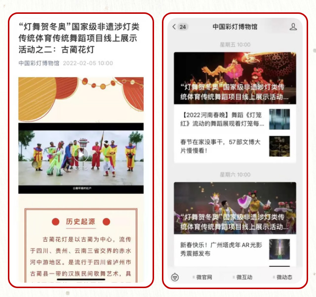 从2月4日北京冬奥会开幕之日起,博物馆在微信公众号与官方网站推出“灯舞贺冬奥”国家级非遗涉灯类传统体育传统舞蹈项目线上展示活动,展示国务院公布的五批国家级非物质文化遗产代表性项目名录中涉灯类传统体育传统舞蹈项目20余个的图文及视频介绍。截至2月6日,三期网文线上浏览量近0.7万人次。