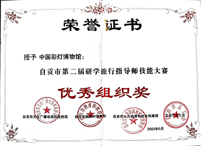 2023年6月,中国彩灯博物馆被自贡市文化广播电视和旅游局、自贡市教育和体育局、自贡市人力资源和社会保障局、自贡市总工会确定为“自贡市第二届研学旅行指导师技能大赛优秀组织奖”。