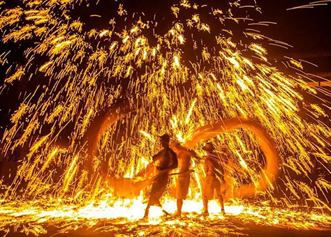 黄龙溪是一座文化底蕴深厚的川西水上古镇,火龙灯舞是这里最驰名也最具民间韵味的一项传统群众文化活动。它起源于南宋,当地先民根据主宰光明与黑暗的“烛龙”、主管风雨的“应龙”及“龙生九子”等相关的神话传说,融合蛇身、鹿角、虎眼、牛耳、象腿、马鬃、鱼鳞、兽须,创造了火龙灯舞这一优秀的民间表演艺术