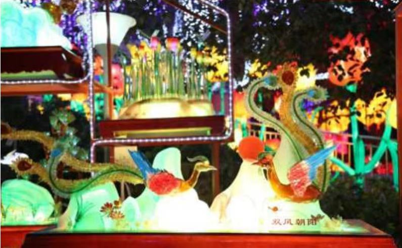 ▲第二十一届自贡国际恐龙灯会玻璃吹塑灯组《双凤朝阳》。