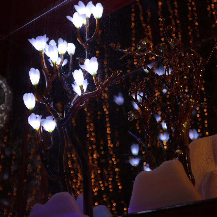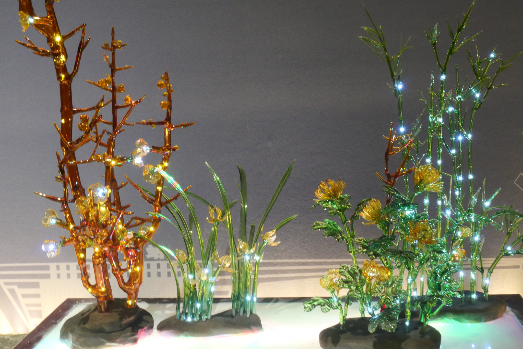 ▲馆藏灯组《四君子》运用玻璃吹塑制灯技艺,造型为“空心”的松林、竹林、梅林、兰花,可以将电源线穿越其间,实现自贡彩灯“内透光”的艺术特色,现展示在我馆自贡彩灯精品二厅。