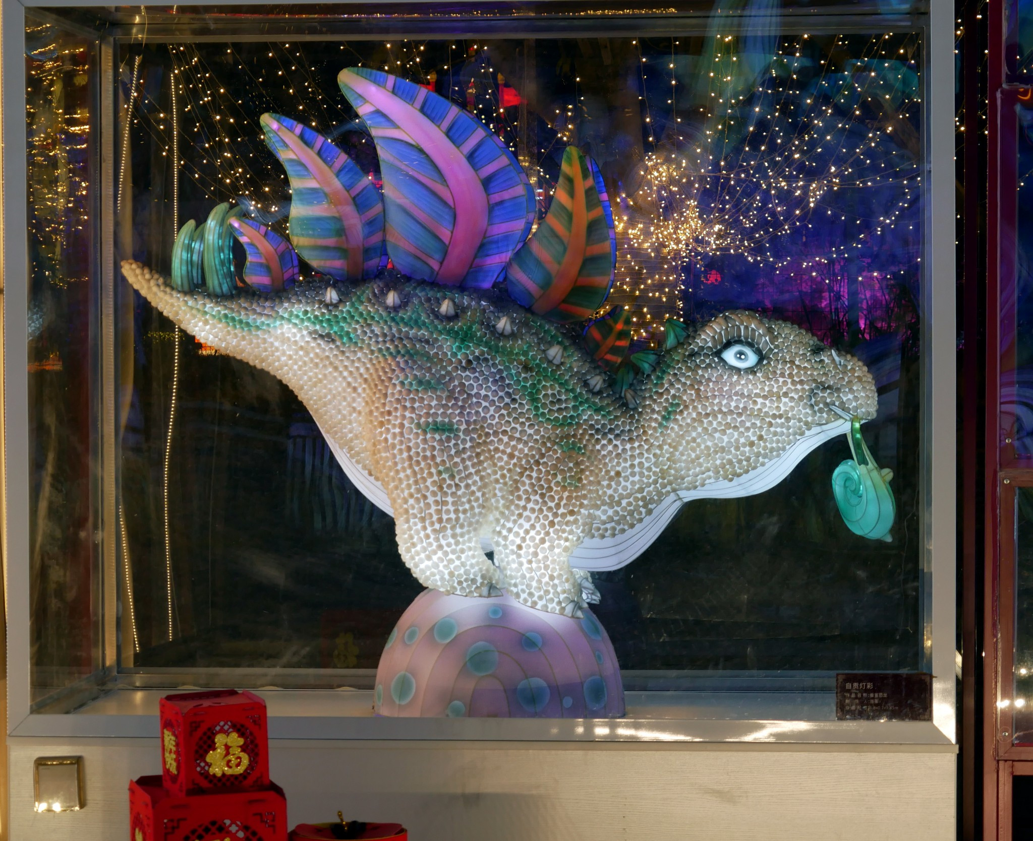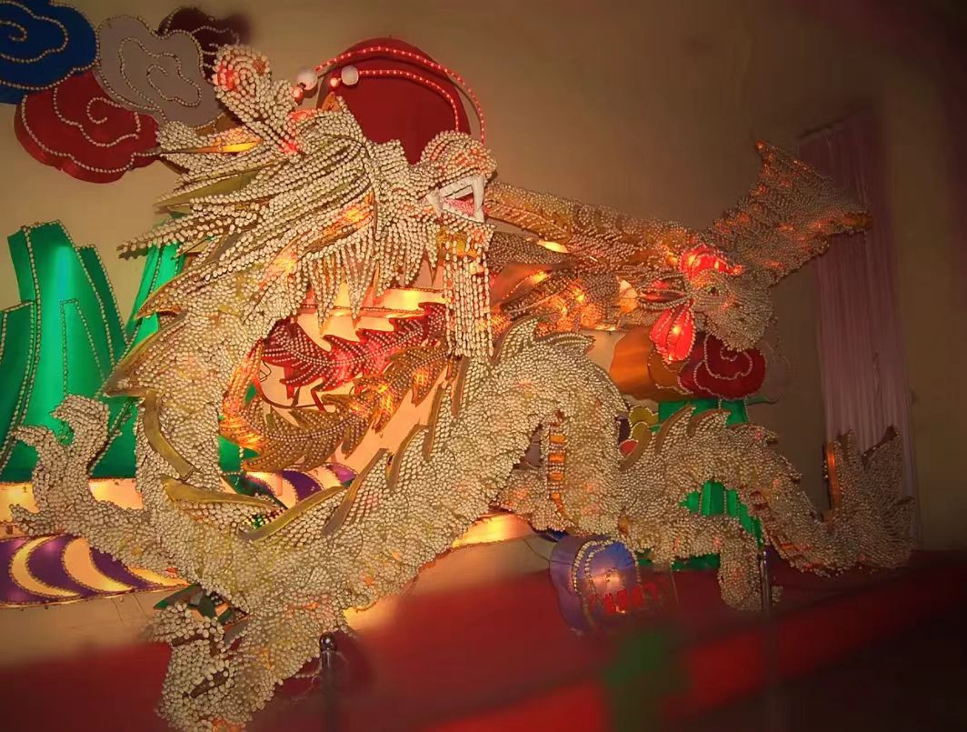 ▲馆藏灯组《双冠龙》采用钢骨架丝雕造型、内透LED灯发光、外部丝绸装裱并以天然环保蚕茧装饰,精心裁剪的上万个蚕茧细腻地描绘出恐龙的皮肤肌理,现展示在我馆自贡彩灯精品二厅。