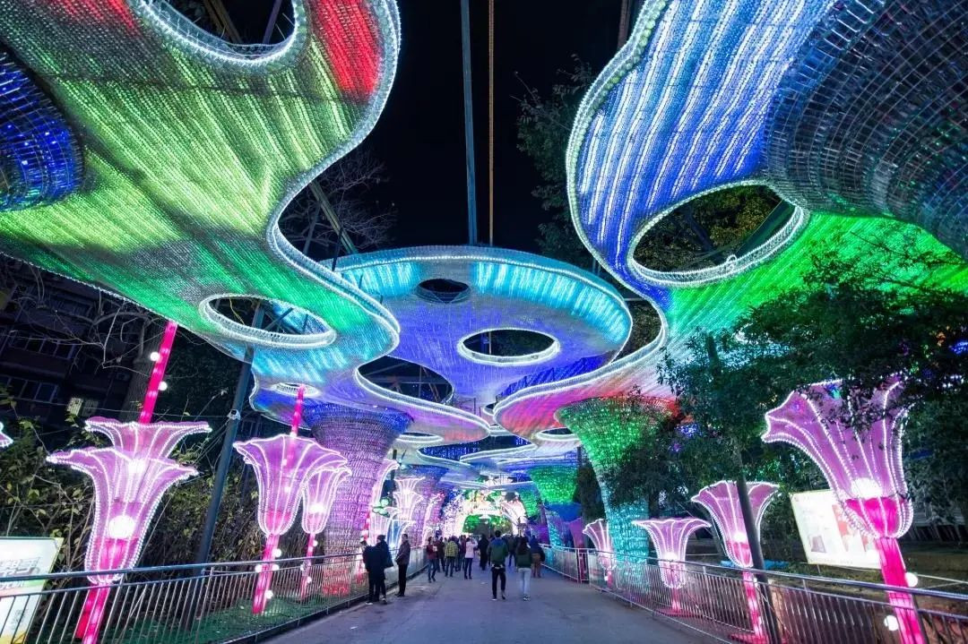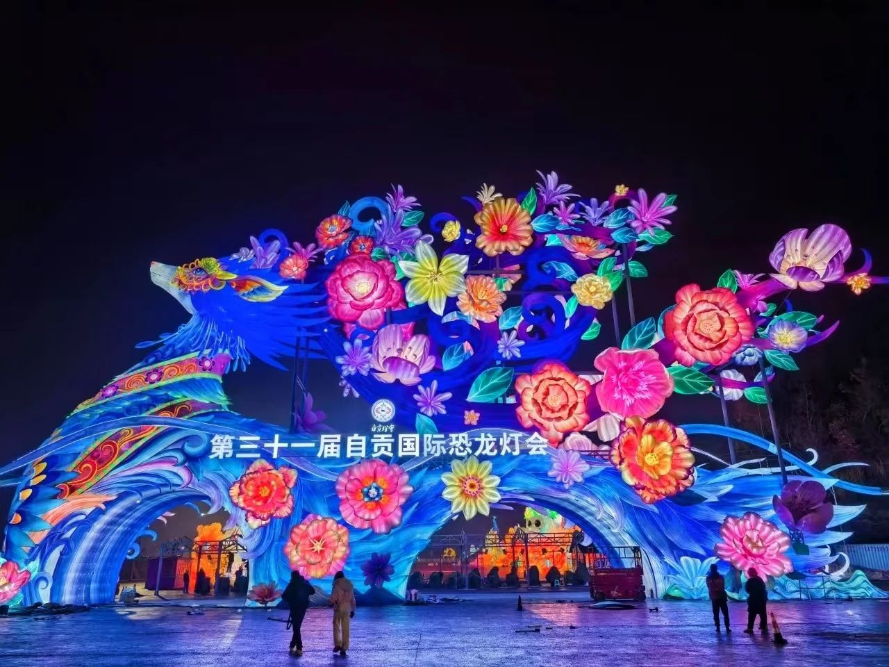 ▲第三十一届自贡国际恐龙灯会北大门灯组《一路繁花》,其部分丝架造型中进行了镂空处理。