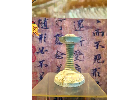 河南陕县刘家渠出土。台为唐代瓷烛台的精美之作。高30.4厘米;灯柱细长束腰,饰瓦棱文,上端承灯盘及圆管状烛插,柱下连浮雕莲瓣灯座,座底有墨书“永”字.造型十分优美,釉色洁白润泽。